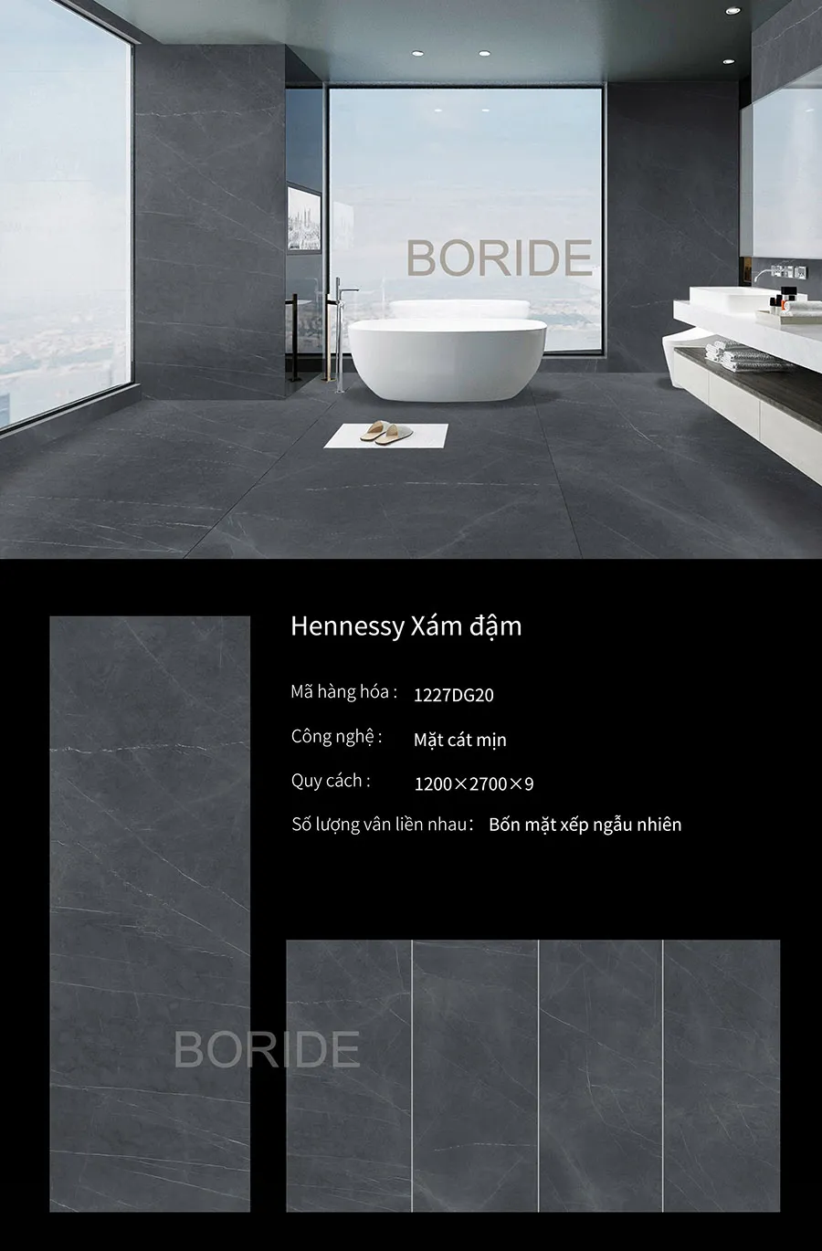 boride 1227DG20 kích thước 1200x2700mm Công nghệ khô MATT mịn. Thương hiệu đá phiến của Ý, sản phẩm có 4 face đường vân ngẫu nhiên, độ dầy 9mm..
